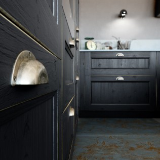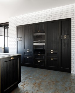 Les façades ANTIKA en chêne massif à nœuds présentent une moulure extérieure usée qui laisse apparaître la blondeur du bois. Loin d’un esprit classique, le bois massif prend une allure moderne grâce au laquage satiné noir. Les poignées en cuivre vieilli marquent le style industriel et renforcent la noblesse des façades en chêne. En plus d’un style bien marqué, elles proposent une très bonne préhension. Design et praticité ne font plus qu’un.