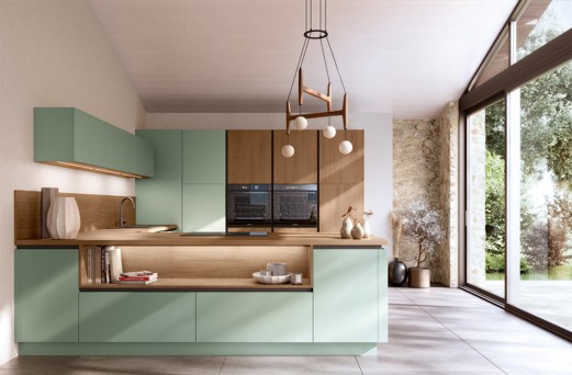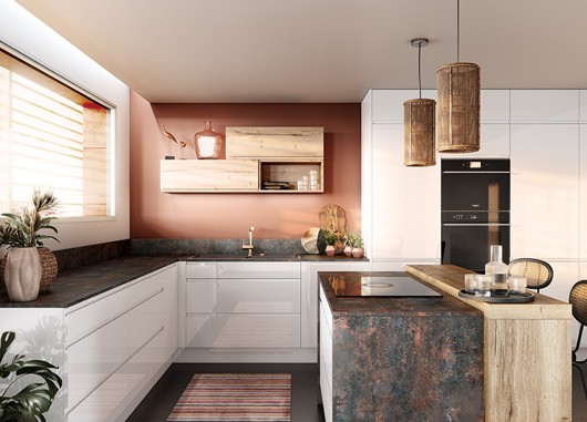 Cette cuisine en U séduit par l’alliance harmonieuse du Vert Céladon et du Chêne de Mervent brun, deux nouveaux décors de la collection Capsule Cuisines YOU 2024. Le Fenix® Vert Céladon, au fini ultra-mat, insuffle fraîcheur et modernité, tandis que le Chêne de Mervent brun, avec son veinage hyperréaliste, apporte une touche naturelle et chaleureuse. Conçue sans poignées, cette cuisine moderne en U se distingue par ses éléments décoratifs soignés, comme la niche intégrée à l’îlot central, idéale pour exposer objets ou livres.