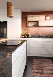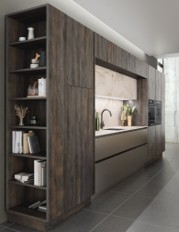 L’îlot central en stratifié Titane, prolongé par une table ronde en FENIX® noir, favorise les moments de partage tout en cuisinant. L’agencement mise sur la praticité avec de nombreux casseroliers anthracite et des remontées en métal ou en verre fumé. Les rangements facilitent le quotidien, avec tout à portée de main. Le mélange harmonieux des matériaux, souligné par des niches ouvertes en placage bois, apporte une touche décorative et raffinée à l’ensemble.