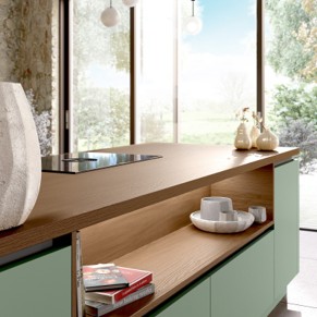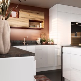 Cette cuisine allie design et fonctionnalité avec un plan de travail en chêne de 6 cm d’épaisseur. Les poignées profil noir mat, conçues exclusivement pour YOU, apportent une touche élégante et assurent une prise en main confortable. Côté rangement, trois options s’offrent à vous : ouvert, fermé ou vitré. Cette cuisine en L avec îlot central devient un véritable espace de vie, convivial et adapté à un usage quotidien.
