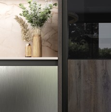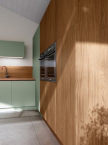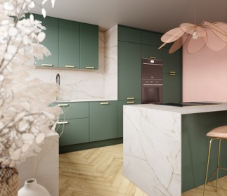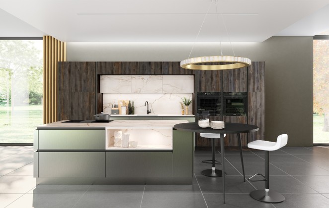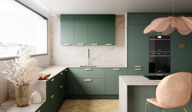 Cette cuisine moderne adopte une ambiance végétale chic, alliant teintes naturelles et matériaux sophistiqués. Les façades IDAO en Fenix® Vert Eucalyptus apportent modernité, douceur au toucher et résistance. Associés à un plan de travail en marbre clair et une crédence toute hauteur, les éléments forment un ensemble élégant et contemporain. Les poignées en or brossé ajoutent une touche raffinée, renforçant l’harmonie et la sophistication de l’ensemble. Le FENIX, vous connaissez ? Ce matériau au toucher soyeux protège des traces de doigts, des bactéries et résiste aux rayures. Vous tomberez sous le charme de ses nombreux atouts !