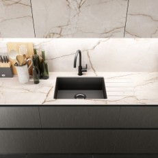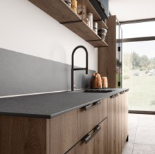 Le modèle ATOLL & OLÉRON mise sur une alliance raffinée de matériaux : le décor Forêt Noire, mêlant bois et minéral, habille les armoires. Le stratifié Titane brossé modernise les meubles bas. L’éclairage LED met en valeur ces textures avec élégance. Sans poignées, les façades épurées renforcent le style contemporain. Le plan de travail en compact décor Marbre clair, fabriqué en France, s’accorde à la crédence et à la niche de l’îlot. La robinetterie noir mat contraste harmonieusement avec ce marbre, pour un rendu chic et distinctif. L’association des décors Titane brossé, Forêt Noire et Marbre clair donne naissance à une cuisine élégante et pleine de caractère. Une niche ouverte en bout d’armoire permet de personnaliser l’espace avec vos objets déco favoris.