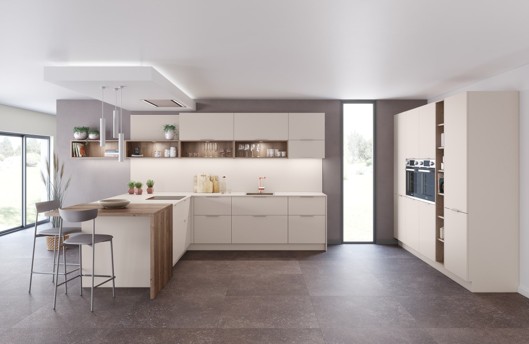 Les façades Blanc de Lait apportent de la clarté, tandis que le décor Cannelé Naturel insuffle une ambiance chaleureuse. Multiples et bien intégrés, les rangements allient praticité et esthétisme, pour une cuisine en U ouverte aussi belle que fonctionnelle au quotidien.