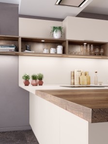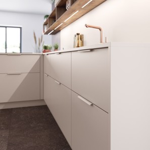 L’alliance du cashmere et du chêne crée une atmosphère à la fois apaisante et chaleureuse. Le ton cashmere, chic et intemporel, s’harmonise facilement avec tous les styles, tandis que le bois apporte une touche naturelle. Des détails soignés, comme l’éclairage LED sous les niches, optimisent la luminosité sur le plan de travail. Le modèle DUNE séduit par ses lignes épurées, sa poignée sur chant discrète et ergonomique, parfaitement intégrée à la façade. Un choix idéal pour une cuisine moderne, pratique et élégante.