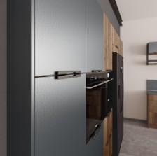 Découvrez les façades avec poignées intégrées : design discret, prise en main confortable et épaisseur de 22 mm. Le saviez-vous ? En PET premium recyclable, un thermoplastique haut de gamme, les façades s’inscrivent dans une démarche durable. Vous avez remarqué les armoires toute hauteur ? Elles offrent un effet bloc très esthétique et une belle capacité de rangement.