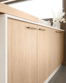 L’association des façades IDAO Blanc de Lait mat et OLÉRON Cannelé Naturel offre une ambiance zen, typique d’une cuisine scandinave bois et blanc. La table en prolongement de l’îlot, en mélaminé Chêne des Landes, propose un coin repas/snack très pratique au quotidien. L’effet strié du Cannelé Naturel apporte du relief et de la texture à la cuisine ! Agréable et surprenant au toucher, vous pourrez sentir les différentes stries qui habillent la surface de la façade. Les poignées associées en or griffé rappellent les stries des façades et complètent harmonieusement le mélaminé.