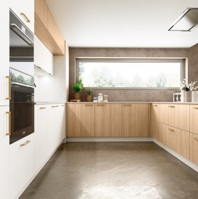 Conçue pour un usage quotidien, la cuisine en U optimise l’espace en combinant zones de préparation, de cuisson et de rangement. Idéale pour les intérieurs modernes, cette configuration offre un accès rapide et pratique à tous les équipements. L’esthétique minimaliste repose sur des façades sans poignées qui simplifient l’entretien et renforcent le style contemporain. Le plan de travail en stratifié imitation chêne s’harmonise parfaitement avec les façades. Les nombreux tiroirs et placards facilitent l’organisation et permettent de garder l’espace ordonné, tout en ayant l’essentiel à portée de main.
